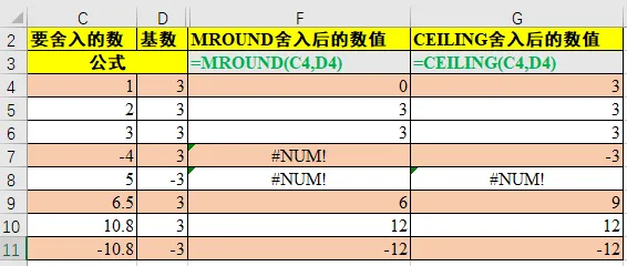 ❷ 要舍入的数和基数的符号必须相同。如果不相同,将返回 #NUM 错误。