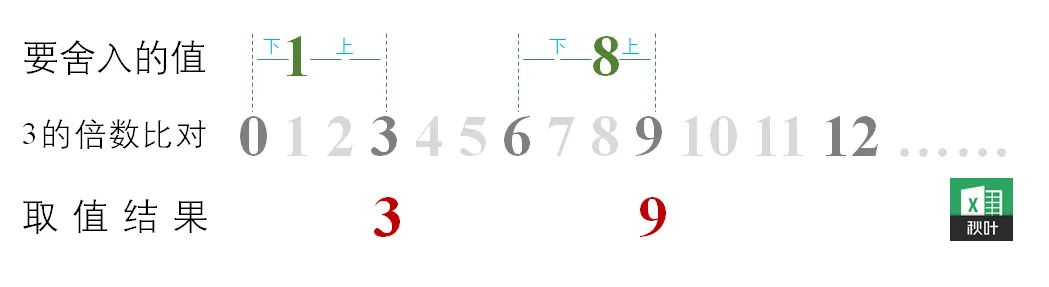 将要舍入的数向下舍入(沿数值减小的方向)为最接近的基数的倍数。如,12 大于 9,则 9.973 取数为 9。