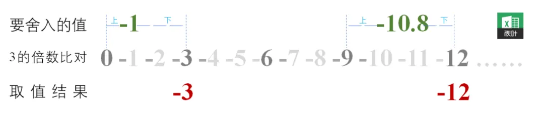 将要舍入的数向上舍入(沿数值增加的方向)为最接近的基数的倍数。如,-9 大于-12,则-9.973 取数为-9。