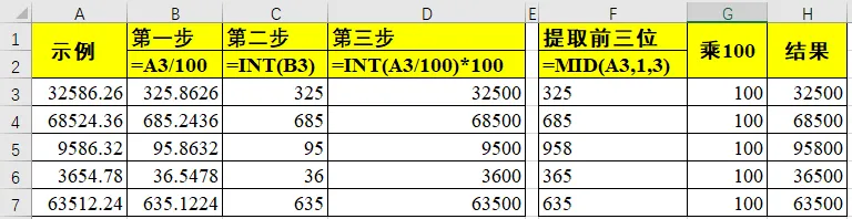 =int(单元格数据/100)*100将所有数字除以 100,使用 INT 函数取整,取整后的数字乘以 100。