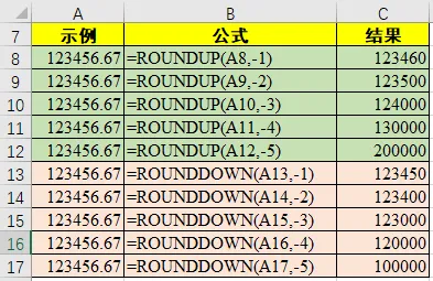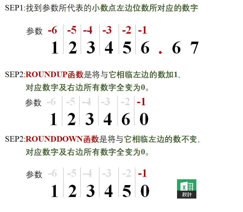 当要保留的小数位数参数小于 0 的时候,ROUNDUP 函数将「向上舍入」到小数点左边对应位数,而 ROUNDDOWN 函数将「向下舍入」到小数点左边对应位数,具体说明如下: