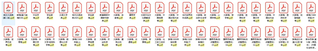 大辞海:含法学 / 世界历史 / 世界地理 / 中国古代史 / 中国近现代史 / 中国地理 / 中国文学 / 外国文学 / 宗教 / 哲学 / 心理学等20 + 学科分卷 PDF,还有交通 / 体育 / 信息科学 / 军事 / 农业科学 / 化工轻工纺织 / 医药科学 / 天文学・地球科学 / 建筑水利 / 政治学・社会学 / 数理化力学等专业分卷,覆盖文理工医全学科; -