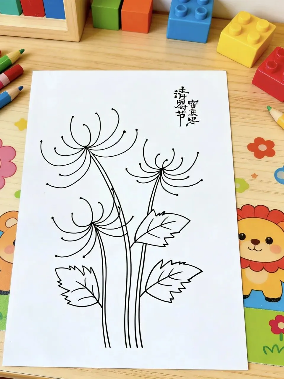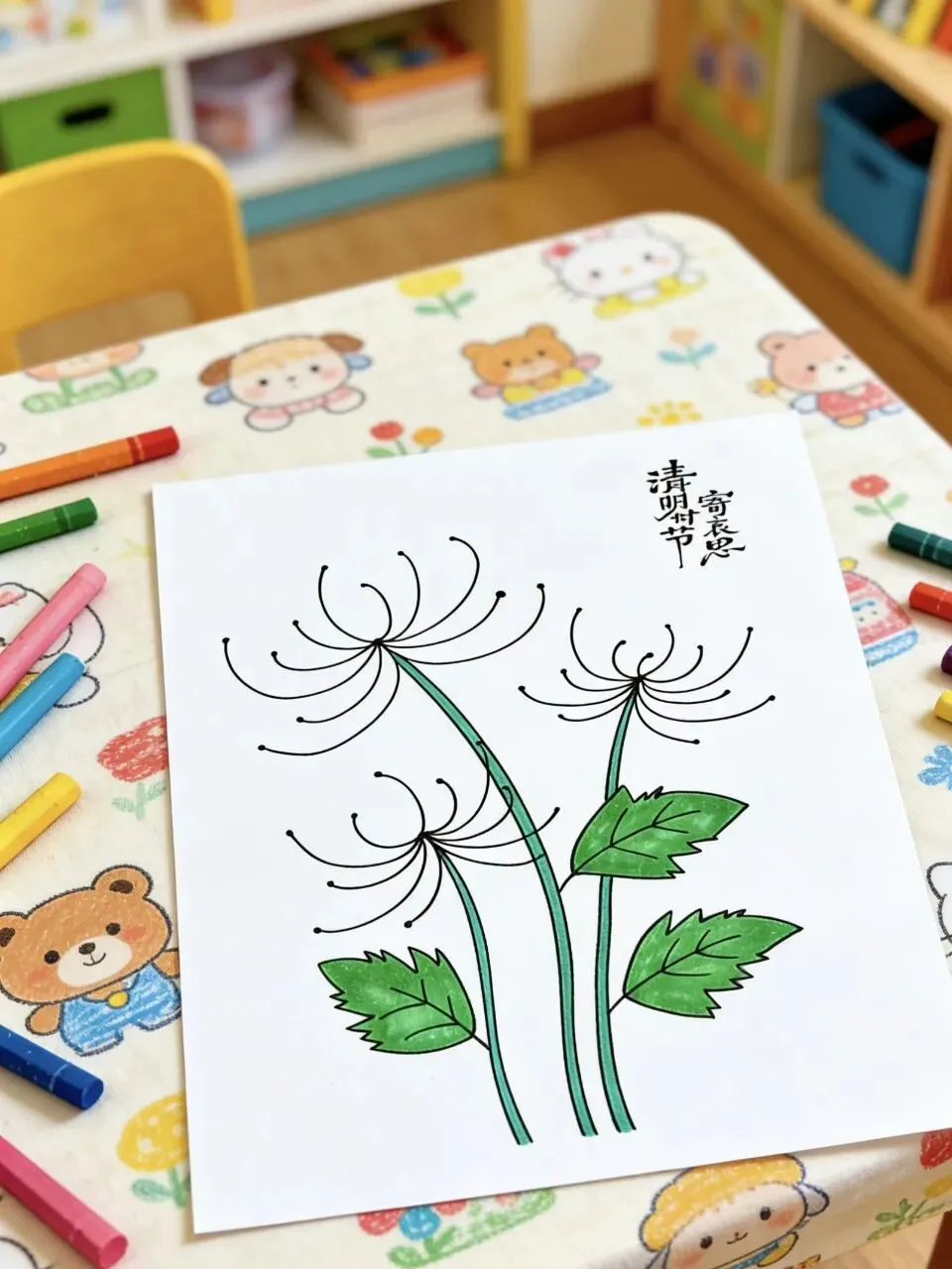 1. 打印线稿:直接获取图中干净的菊花轮廓,省去勾线步骤,低龄宝宝也能轻松上手