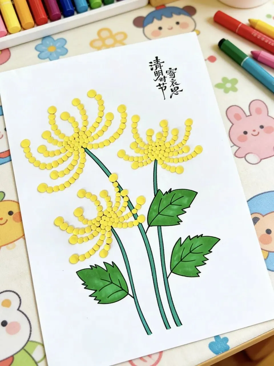 3. 黏土点缀:揉一揉黄色黏土小球,粘贴在花瓣轮廓里,让菊花“绽放”在纸上