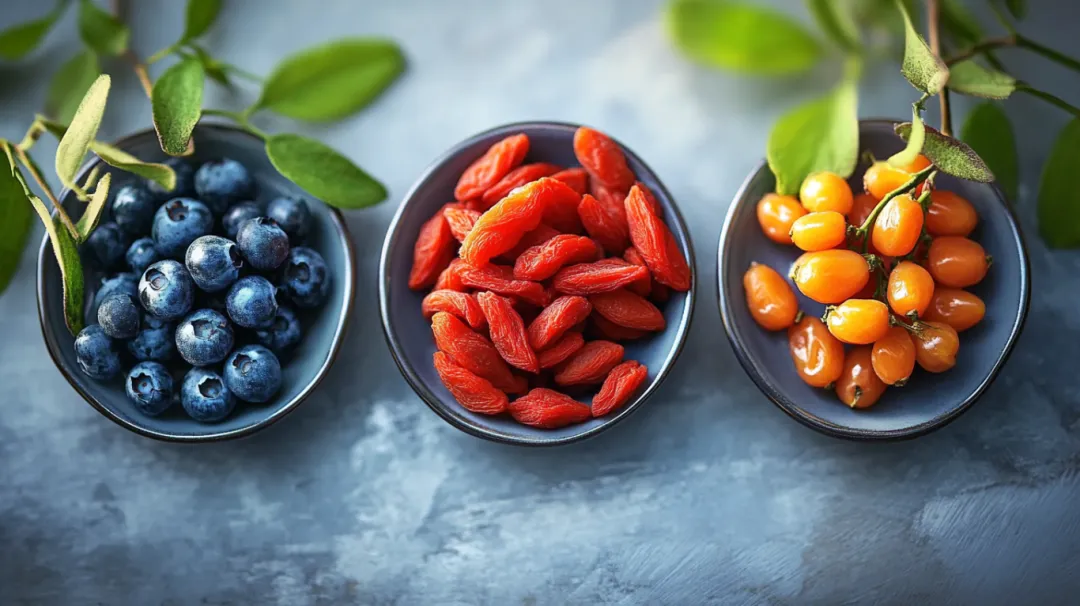 颜色鲜艳的果蔬如枸杞、沙棘、蓝莓等富含膳食纤维、维生素C和黄酮类、多糖类化合物和多种抗氧化物质,能有效抵御自由基,对于延缓衰老很有帮助。