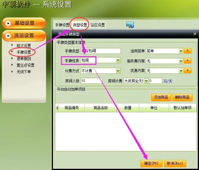 1.首先登陆中顶洗浴软件后台系统设置,洗浴设置→手牌设置→类型设置,注意在添加手牌类型时,手牌性质选择【包间】,确定完成.