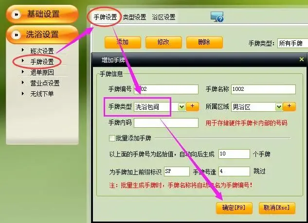 2.再洗浴设置中的手牌设置,添加洗浴包间,注意手牌类型选择上面设置过的【洗浴包间】,这样新建出来的手牌,最后到前台使用时,其实就是洗浴包间.