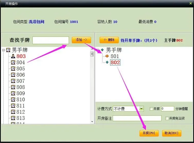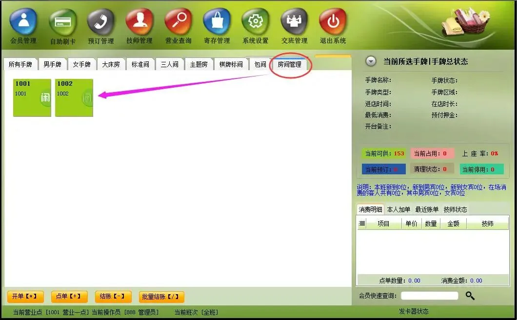 中顶洗浴软件中包间就是和手牌一起使用,开包间时伴随手牌一起来开的,开过的包间,可以再添加启它手牌进来,同时包间内手牌还可以移除出去包间,使用非常灵活。具体设置使用详细流程说明如下: