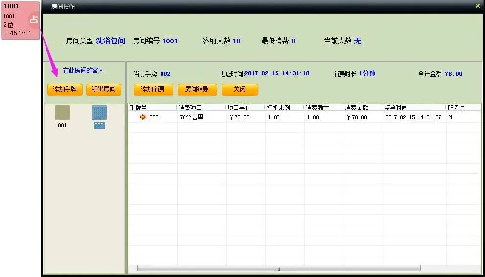5.点开房间操作,可以对洗浴包间进行添加手牌、移出手牌、消费、结账等操作.