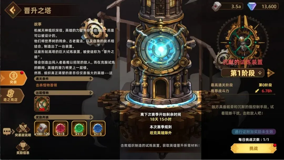 通关晋升之塔,可获得英雄晋升所需的多种材料以及塔顶积分。