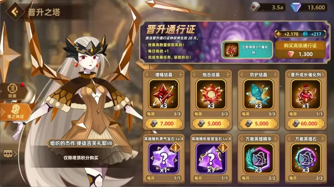 使用塔顶积分,可在塔之商店兑换 晋升材料、增幅结晶、技能宝石Lv.4、万能英雄精华、万能英雄石等丰厚奖励。