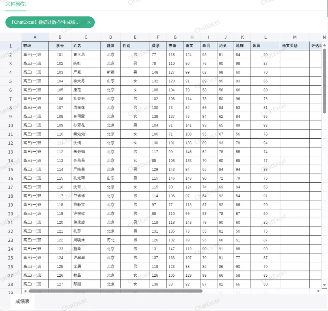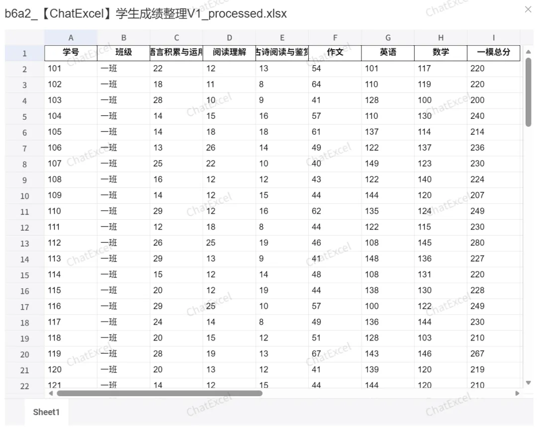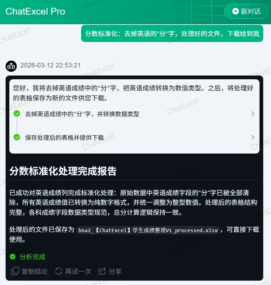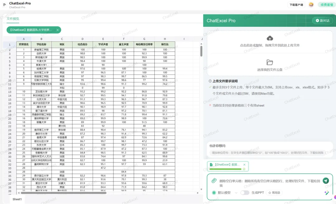 ChatExcel 可以精准识别空白行、格式混乱、缺失单位等问题,一键完成清洗与格式规范。例如上传一份学生成绩统计表,输入: