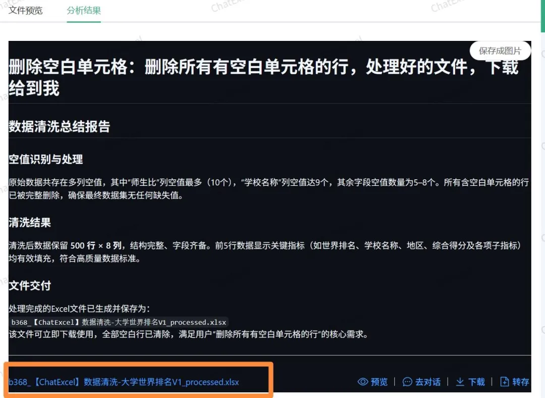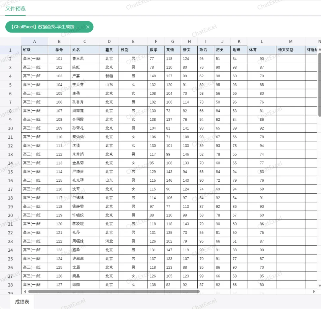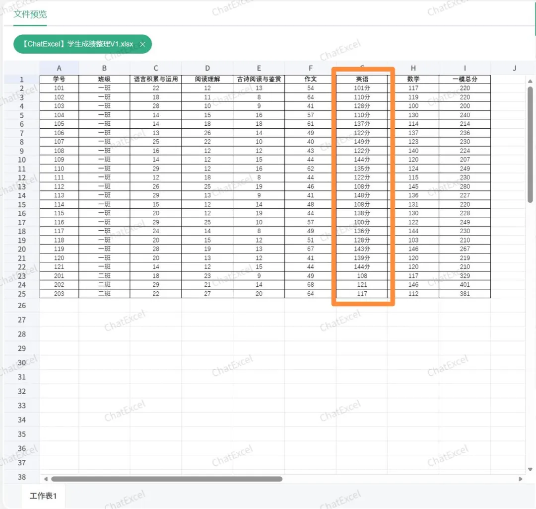 ChatExcel 可以精准识别空白行、格式混乱、缺失单位等问题,一键完成清洗与格式规范。例如上传一份学生成绩统计表,输入:
