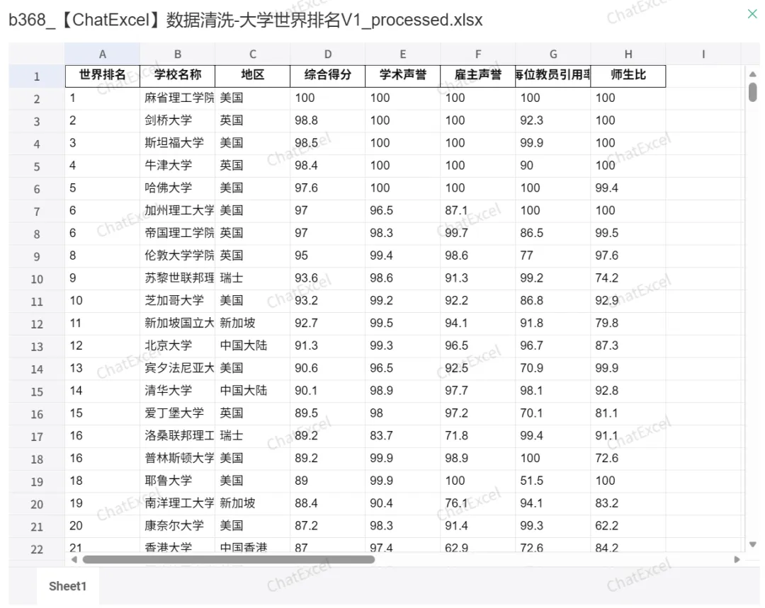 Chat Excel AI 会自动完成数据净化与格式统一,直接输出干净规范的可编辑表格: