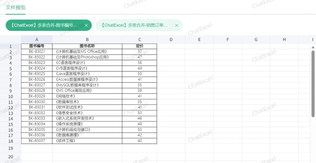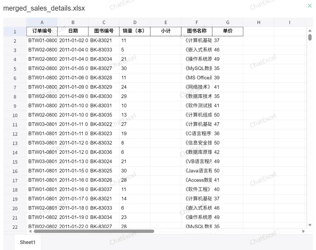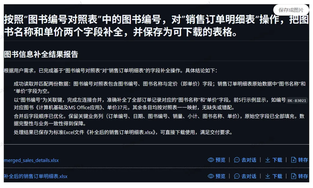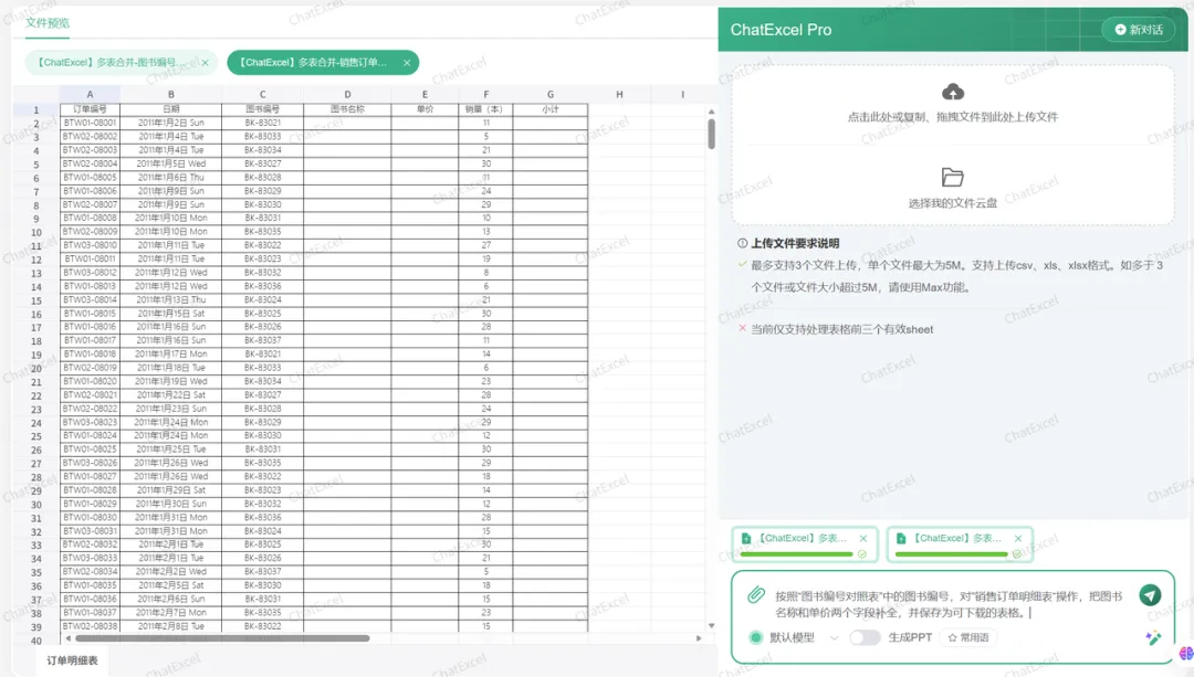 ChatExcel 可以自动识别多表间的关联逻辑,无需手动操作即可一键完成数据整合与字段补全。例如书店销售人员需要统计当月图书销量,上传”图书编号对照表”和”销售订单明细表”两个文件后,输入: