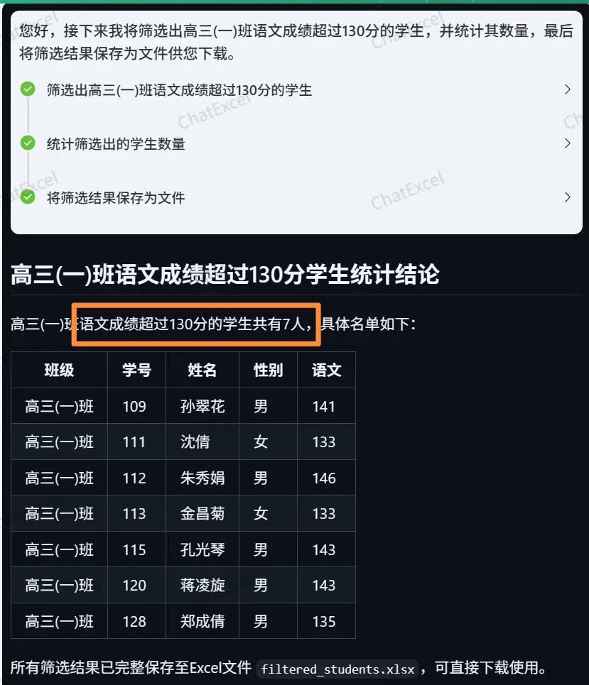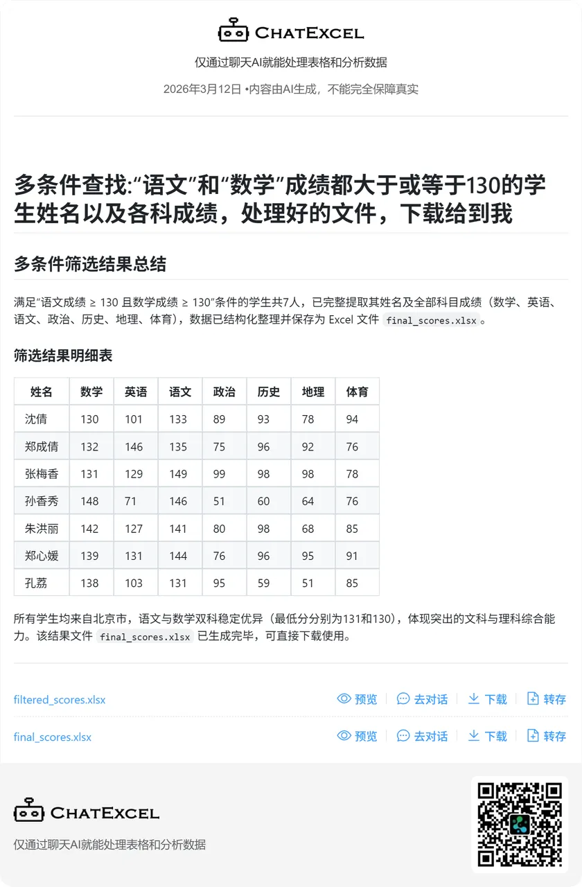 AI 将分析检索同学们的成绩,筛选语文、数学均≥130分的同学并整理成一个新文档,清晰直观: