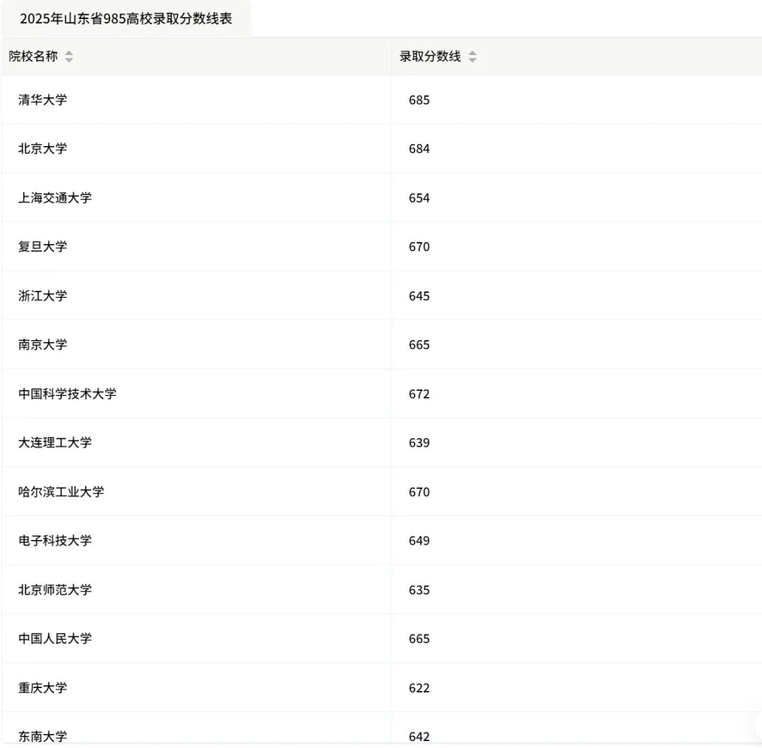 生成2025年39所985高校在山东省的录取分数线,包含院校名称和对应的录取分数线