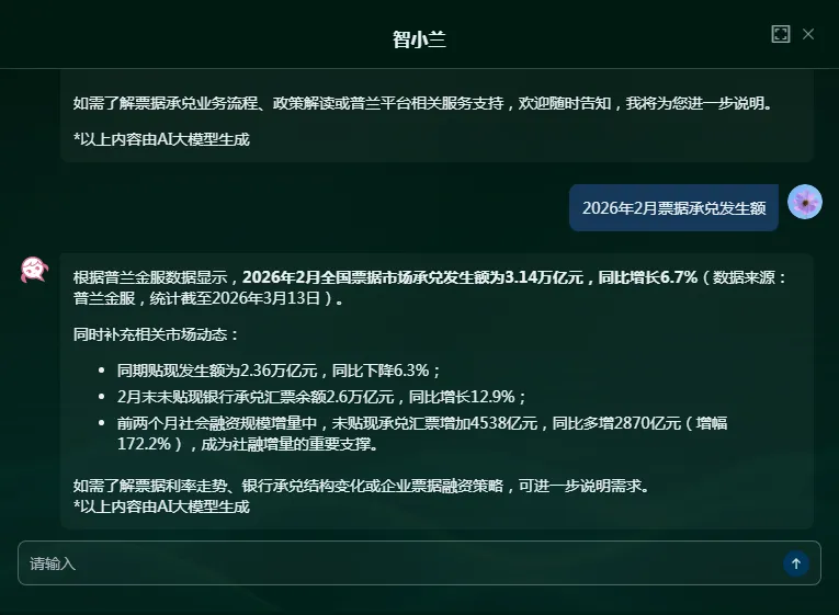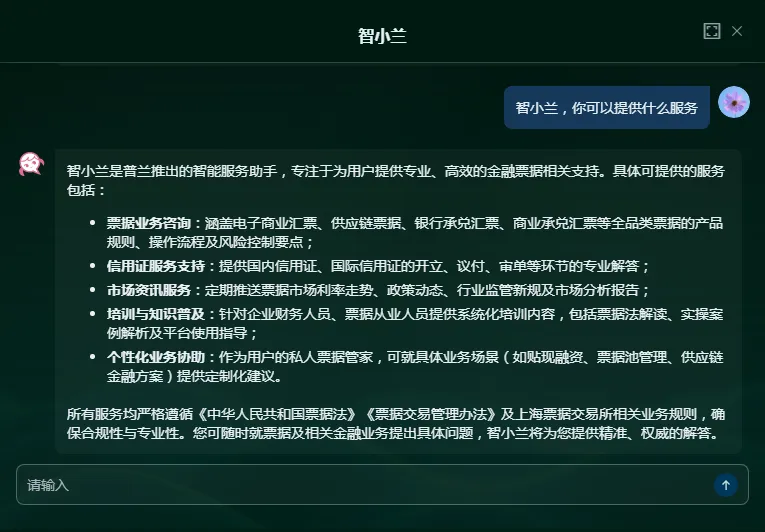 日前,普兰金服 AI 助手「智小兰」已完成上线部署,该助手聚焦票据业务需求,为用户提供专业、高效的票据信息服务,助力提升票据相关办公及业务办理的效率与专业性。
