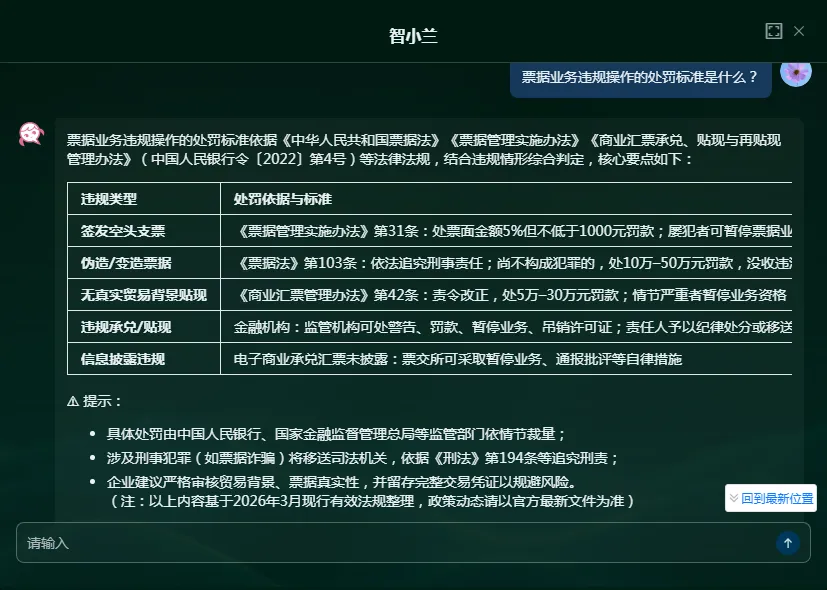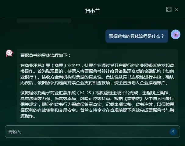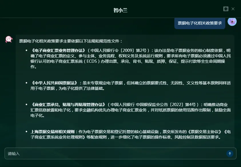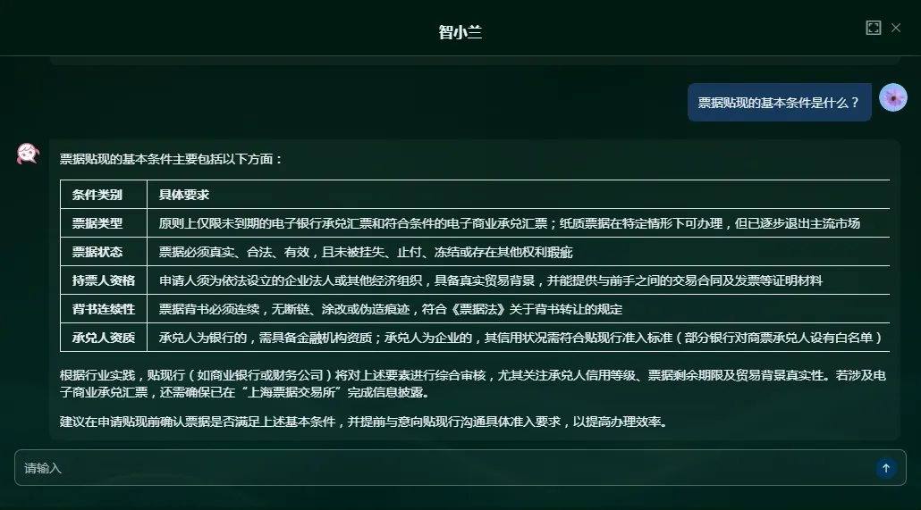 针对票据业务从业者的专业知识需求,无论是行业新手的基础疑问,还是资深人员的专业咨询,均可通过向「智小兰」提问获取解答,涵盖票据概念、背书流程、贴现条件等各类行业常见问题。其专属知识库贴合票据领域专业要求,相比通用 AI,解答更具针对性和专业性。