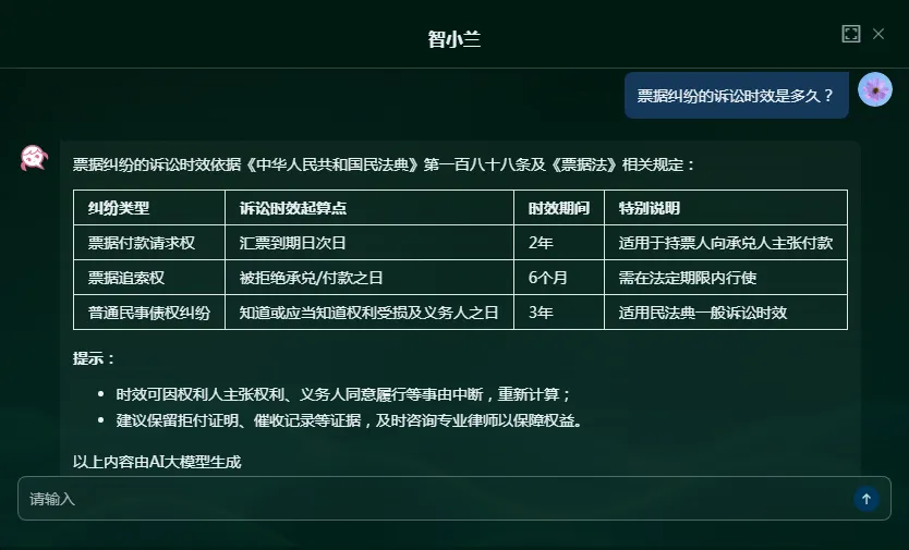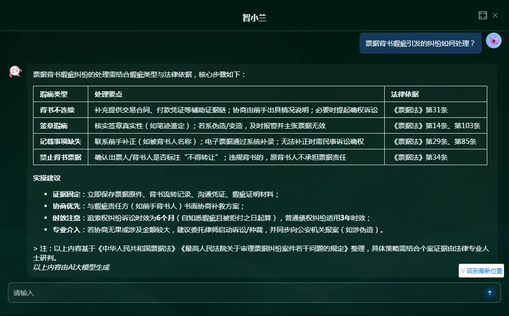针对票据逾期、追索、管辖权等纠纷场景,用户可向「智小兰」咨询相关处理方式。「智小兰」通过提炼核心要点,解析复杂的票据法律问题,为用户应对票据纠纷提供参考。