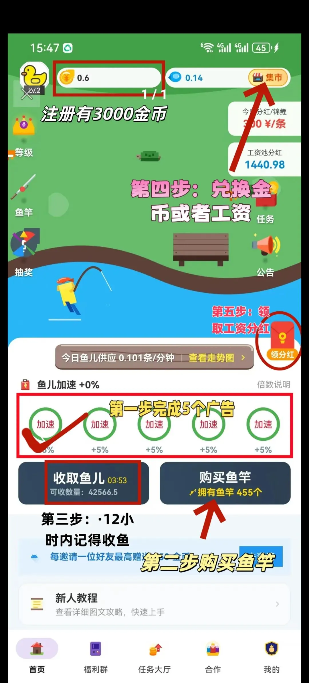 注册→实名领红包→买竿养鱼→收鱼兑换→看广告加速→邀请降费纯零撸,每天几分钟,轻松赚米!