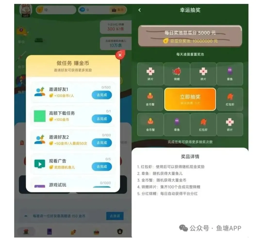 其定位是一款零门槛手机兼职 APP(任务平台+养成分红模式),融合趣味养鱼与任务赚收益。每日看广告、做任务、邀好友即可赚金币,金币可兑换现金提现,操作简单、无需投入,空闲时间轻松赚零花钱,收益透明、提现便捷。