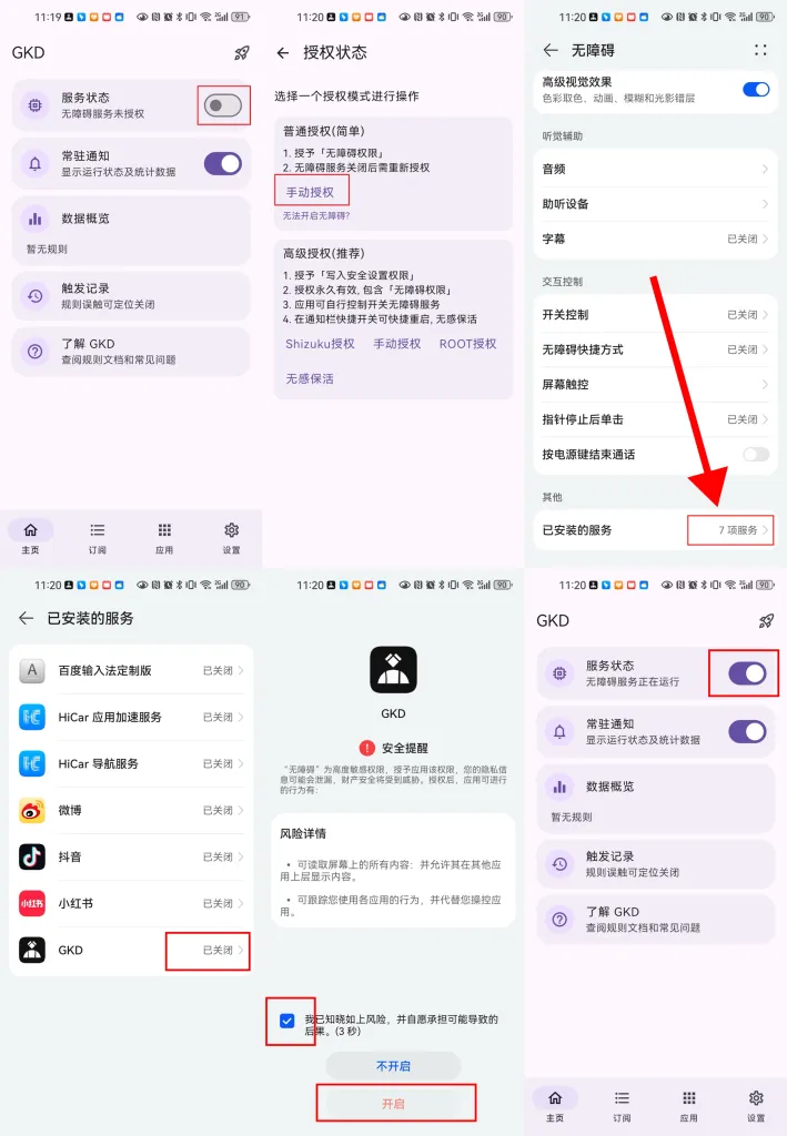 GKD依赖无障碍服务运行,必须给予权限才能工作。部分手机可能需要额外设置(如小米的”后台弹出界面”权限)。