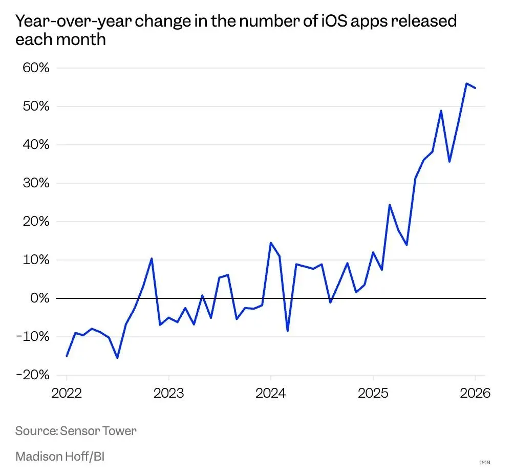 根据市场情报机构 Sensor Tower 的统计,2026 年 1 月美国区新上架的 iOS 应用同比增长 54.8%,而 2025 年 12 月的增幅更达 56%,创下近四年来的最高纪录。虽然官方未披露氛围编程占比,但从增长速度来看,AI 生成的应用已经成为不可忽视的力量。