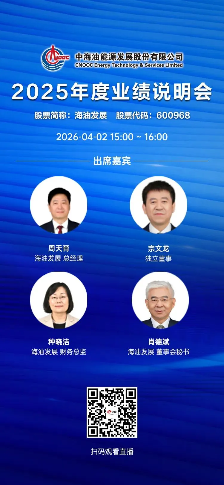 中海油能源发展股份有限公司将于2026年4月2日(星期四)下午15:00-16:00举行2025年度业绩说明会,欢迎广大投资者积极参与!