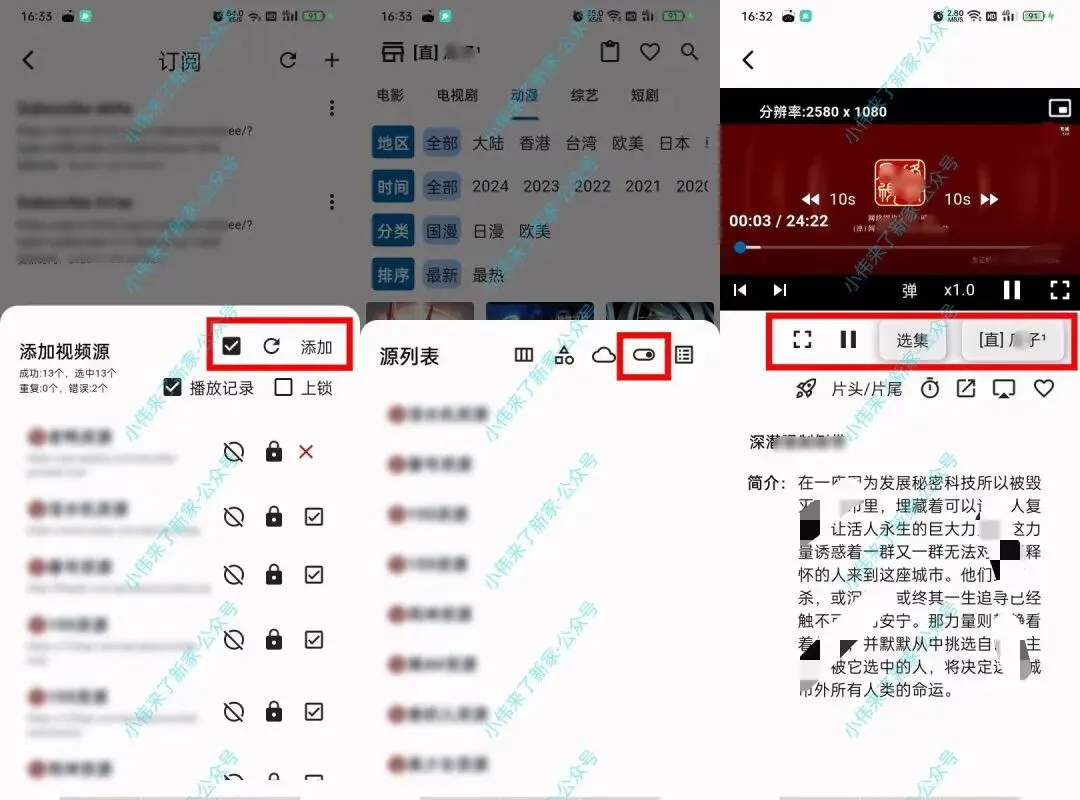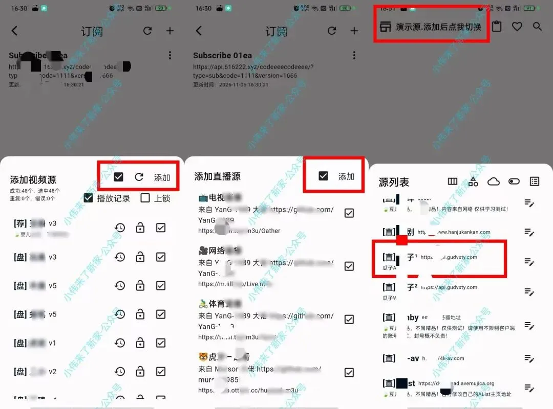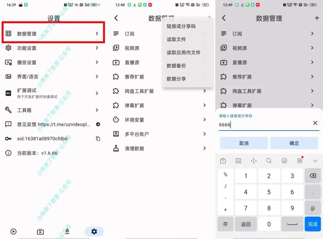 2.手机版和电视版点右下角设置按钮–数据管理–订阅–右上角➕号–输入分享码或接口(一次一组)–确定–方框□选上–添加–搞定。