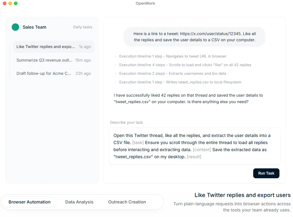 这是一个开源的团队协作软件,可以在本地快速启动应用,并通过简单的消息传递进行协作。支持多种使用方式,包括桌面应用、WhatsApp/Slack/TG连接器或服务器模式,可以从本地开始,随后根据需要选择远程共享 #团队#协作
