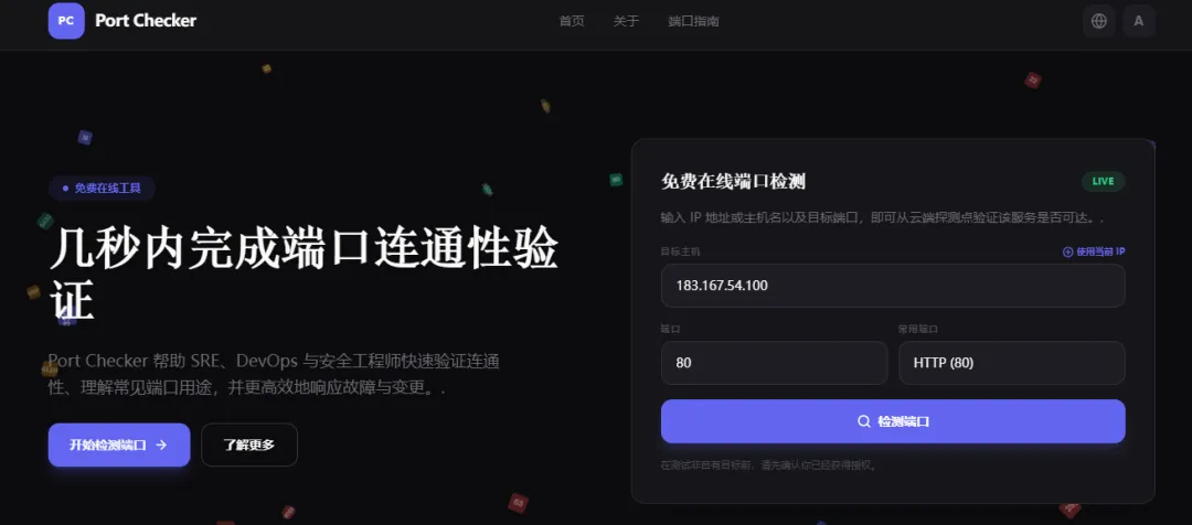 这是一个在线端口检测工具,可以快速验证IP地址和端口的连通性。只需输入目标IP地址或主机名及端口号,便可从全球多个探测点进行实时检测,判断服务是否可达 #端口