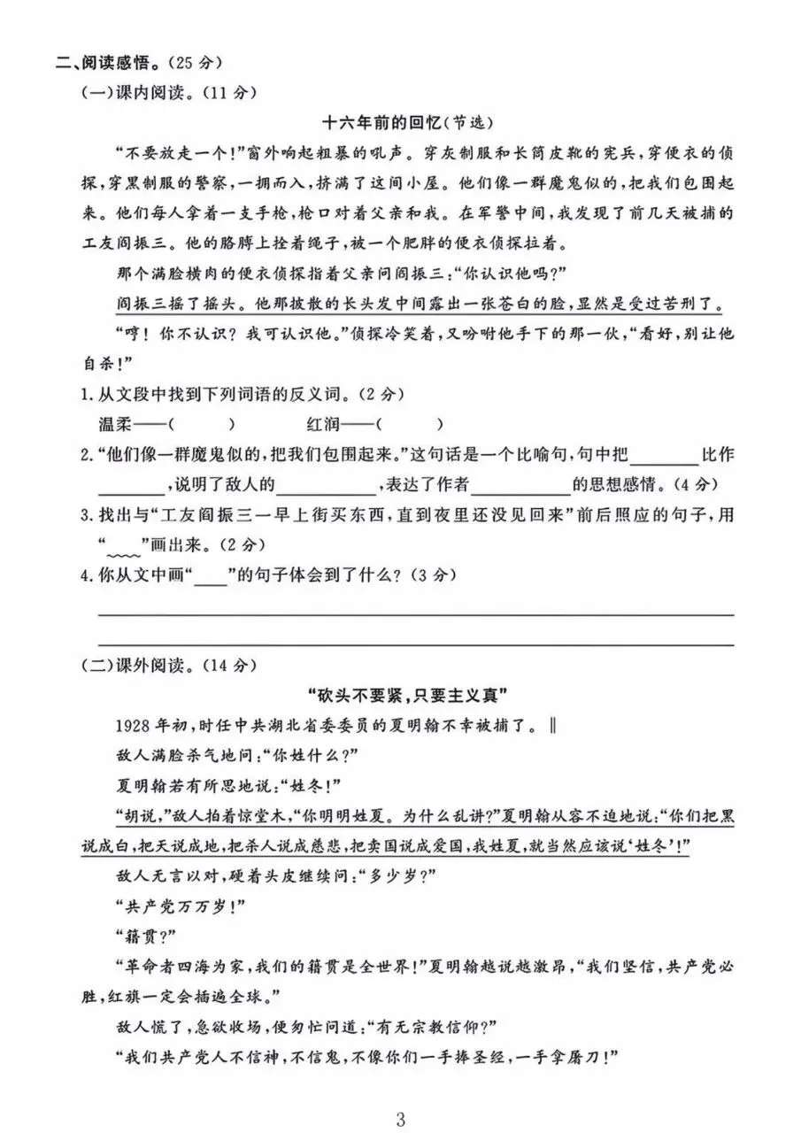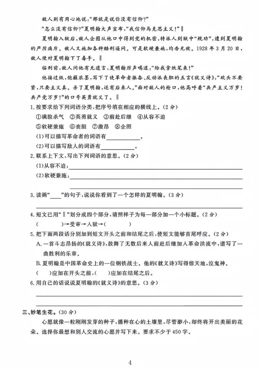 六年级语文下册第四单元素养评估卷电子版免费领取