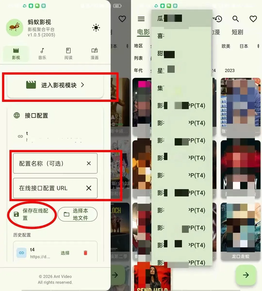 – 自定义源导入:名称随便填,在输入接口,点保存在线配置,在底部进入影视模块就可以了。(图1)