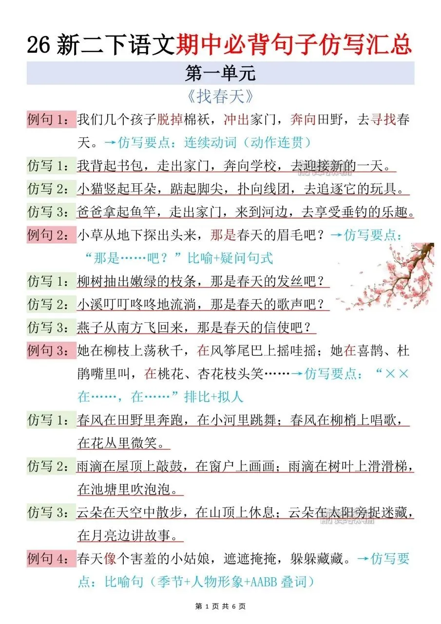 26新二下语文期中必背句子仿写汇总电子版免费领取