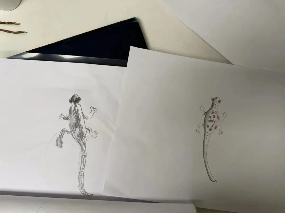 App 的教程很循序渐进:先画框架定比例,再画阴影让平面变立体,最后加纹理和细节。我跟着一步一步来,画了一只壁虎。