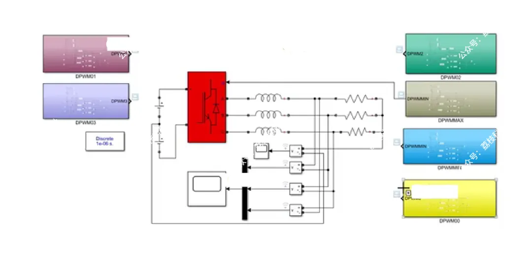 直流母线提供稳定输入电压,母线电容用于稳定母线电位、抑制电压波动;逆变桥按照不同 DPWM 控制信号执行通断操作;滤波电路用于抑制高频谐波,改善输出波形质量;负载模块设置为可调节参数形式,可模拟感性、阻性、容性不同工况,满足各调制策略工况适应性验证需求;调制策略控制单元为核心模块,分别集成 DPWM00、DPWM01、DPWM02、DPWM03、DPWMMIN、DPWMMAX 六种控制算法,通过切换控制逻辑实现不同调制方式的对比仿真。