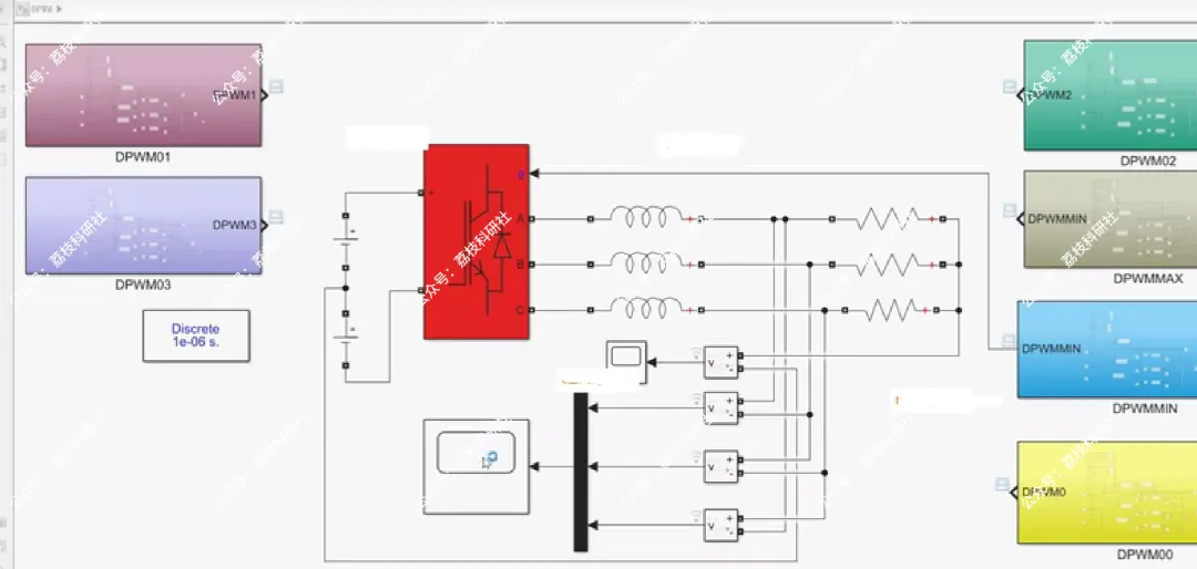 不连续脉宽调制技术通过在工频周期内对特定相进行固定时长的钳位控制,减少功率器件的开关动作次数,从而有效降低逆变器开关损耗、提升变换效率,在电机驱动、新能源并网、不间断电源等电力电子变换场景中具备显著应用价值。三相两电平拓扑作为工业应用最广泛的逆变结构,其不连续脉宽调制可根据钳位相选择逻辑、钳位电平极性以及钳位区间分布规律,划分为多种典型实现方式。本文围绕 DPWM00、DPWM01、DPWM02、DPWM03、DPWMMIN、DPWMMAX 六种经典不连续调制策略,分别阐述其调制原理、钳位规则、工作特性与适用工况,并依托仿真平台搭建完整三相两电平逆变系统,对各调制方式下的输出波形特性、开关动作规律及谐波分布进行对比分析,总结不同调制策略在效率、谐波性能与工况适应性上的差异,为实际工程中不连续调制策略的选型提供理论与仿真依据。
