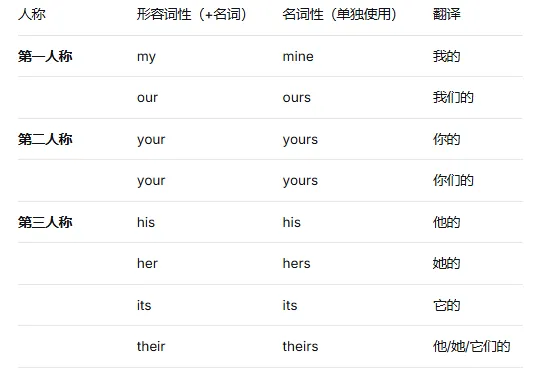 物主代词表示所有者跟物品之间的关系,分为形容词性物主代词和名词性物主代词。用汉语来解释,就是我的,你的,他的,我们的……
