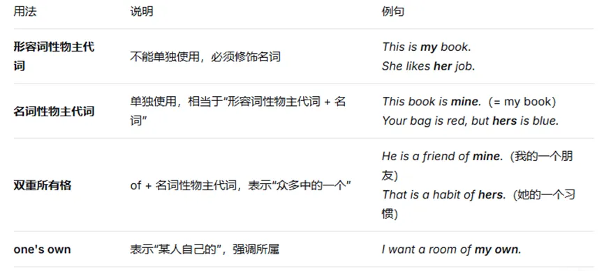 这里需要我们要理解和区分形容词性物主代词和名词性物主代词的区别,前者可以理解为形容词,比如my=我的,只有my 在英语语法中不构成完整的意思,需要在后面增加一个名词,比如my book(我的书),这样才算一个完整的名词短语。