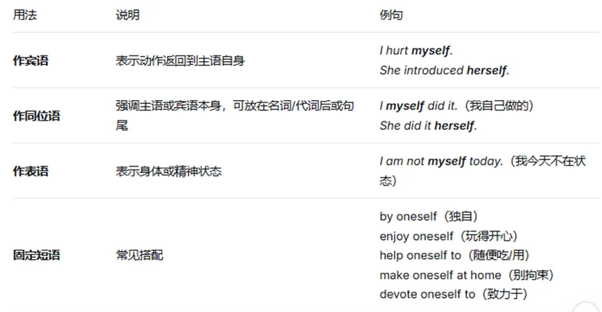 另外要注意反身代词跟人称代词不同,没有主格和宾格的变化。