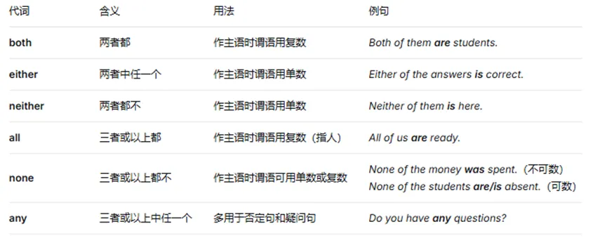 区别这几个单词,第一要注意指代的数量,2个还是3个,第二要注意语义表达,是都要,都不要,任选一个,第三要注意主谓一致,比如both 后面要跟are,但either后面要跟is 。