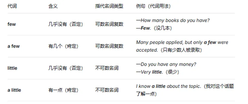这里要注意的是few, a few, little, a little还可以做形容词,比如I have a few friends.,这里 a few修饰可数名词friends,属于形容词范畴。虽然用法类似,但词性还是不同的。