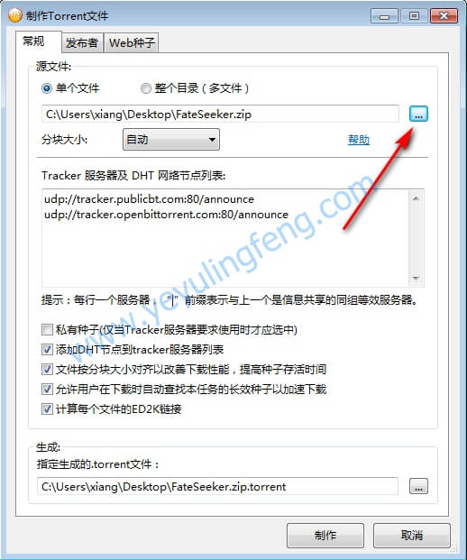 在制作窗口中打开将要被制作的本地文件,在“Tracker服务器和DHT网络节点列表”看看是否有默认的数据,在比特彗星中,无须作任何设置,默认自动连接并使用DHT网络,完全不需要用户干预,如果有需要可以自动添加DHT节点,一般我们直接默认不理会就行了。