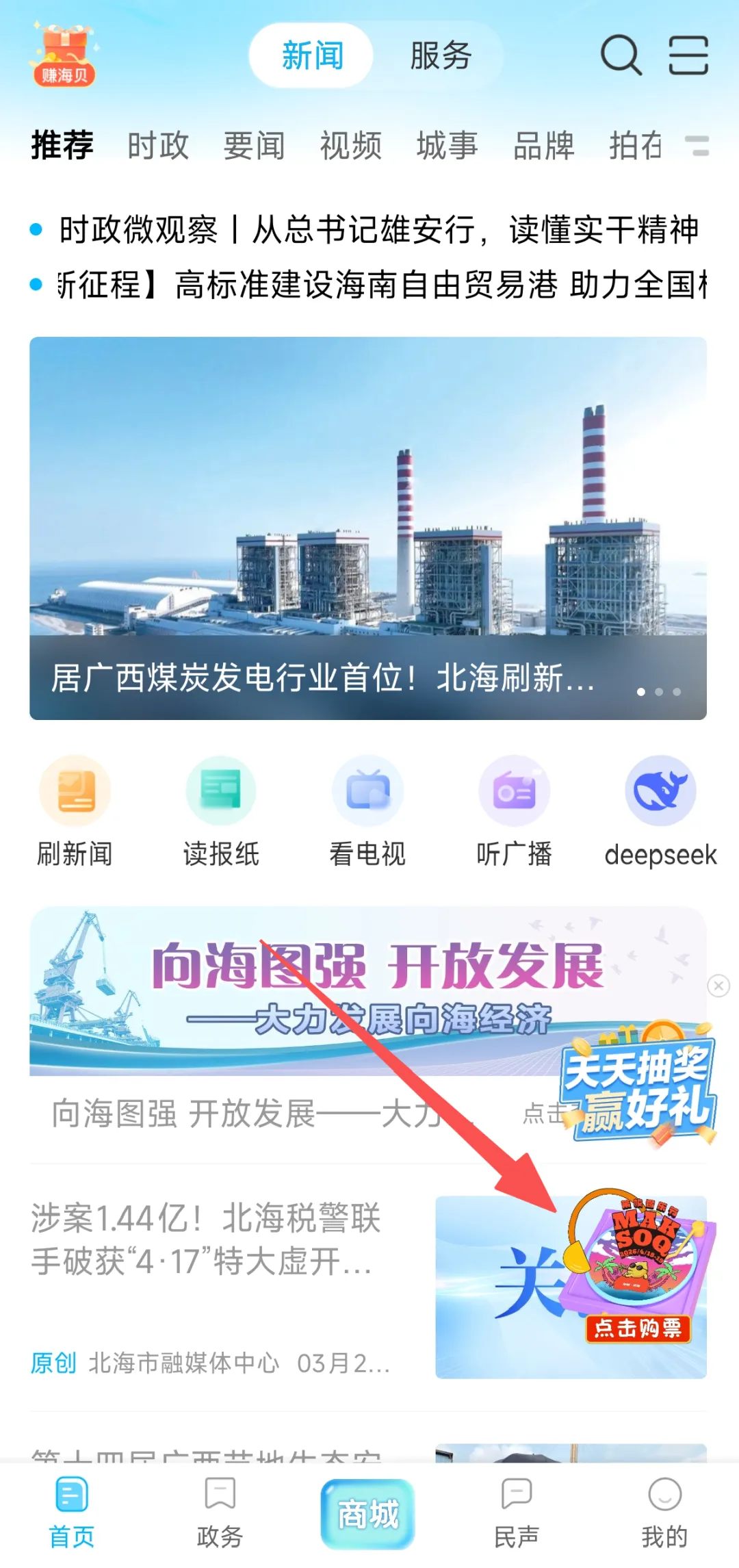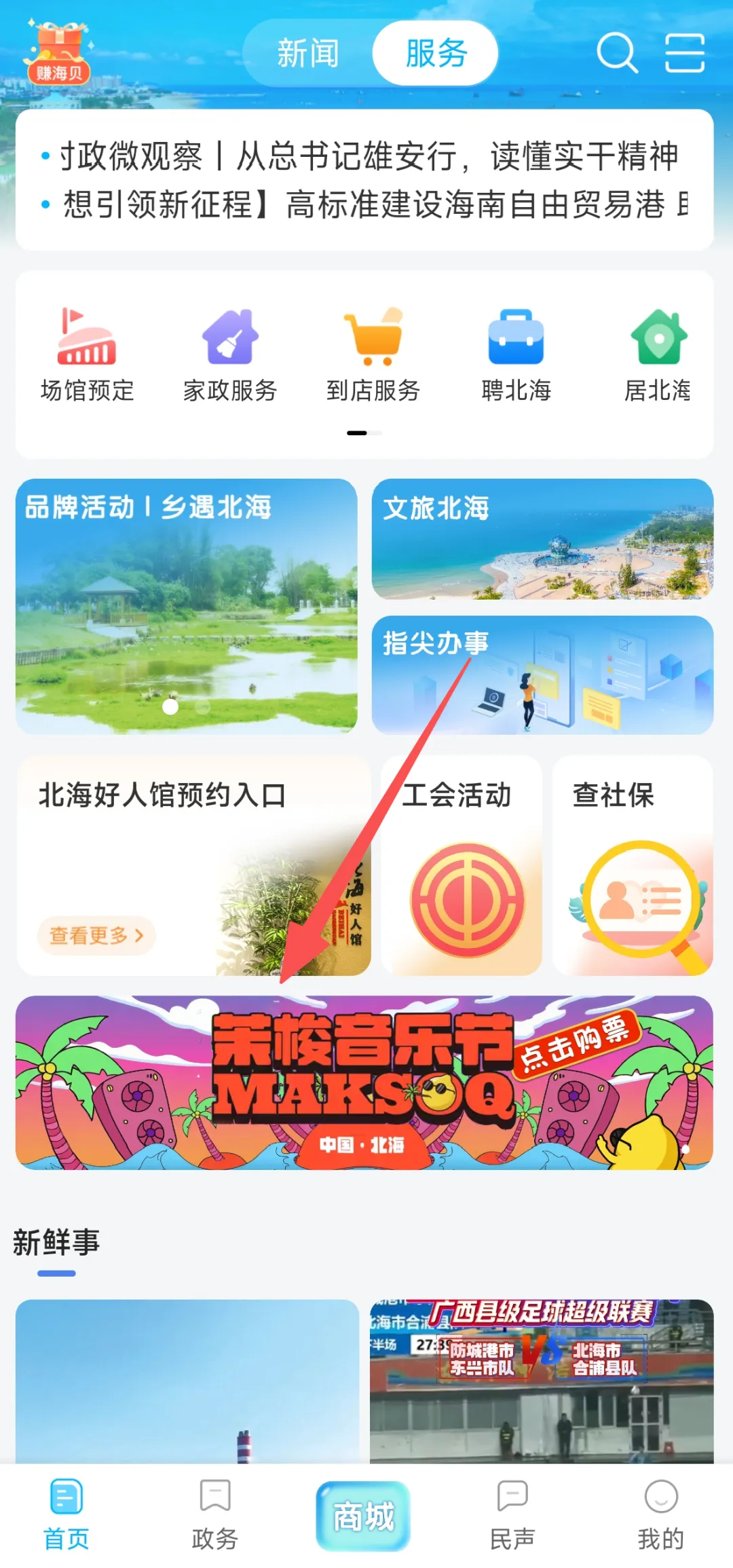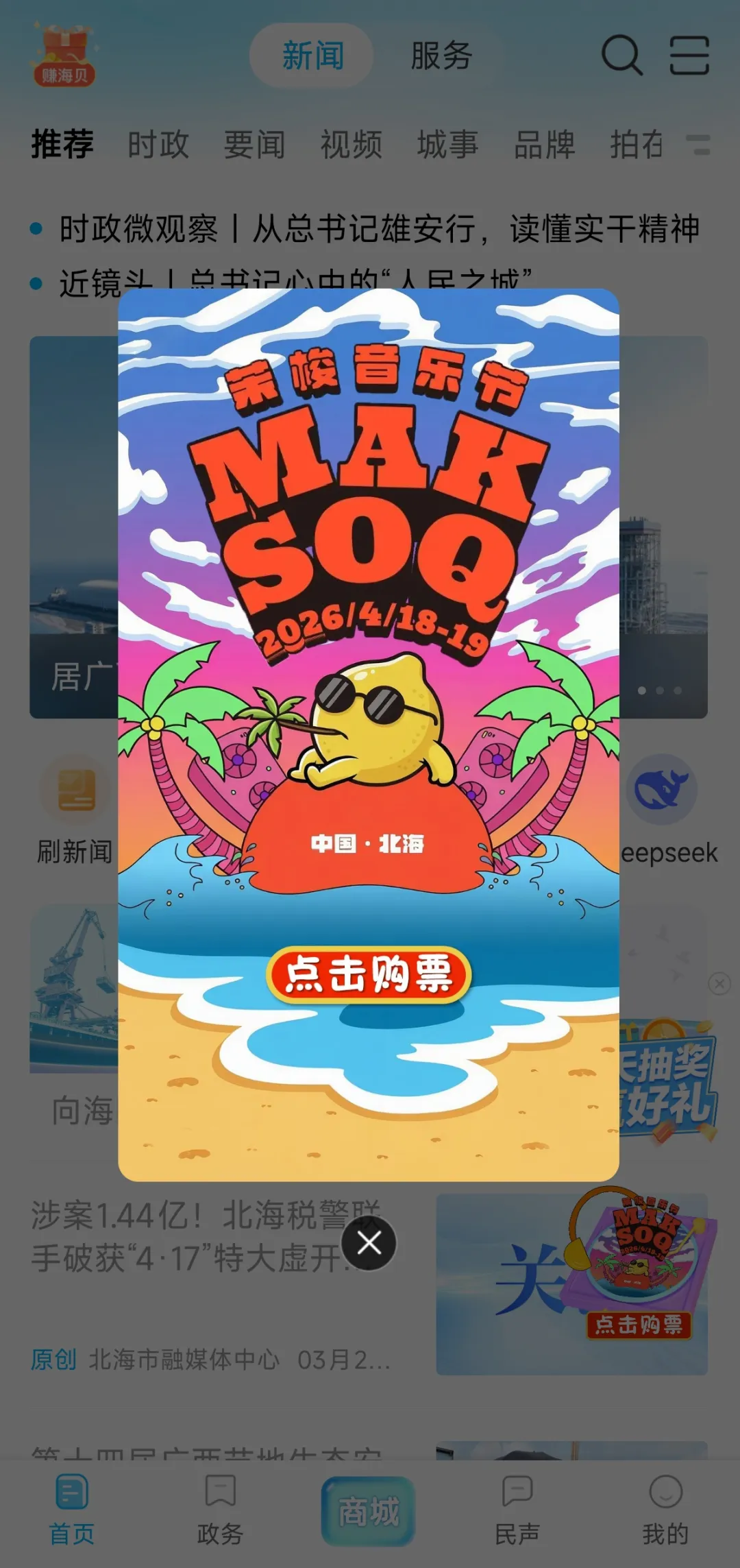2.打开北海融媒App首页,点击购票浮窗按钮即可跳转至购票页面。目前剩余门票价格为:488元/张(VIP区)、936元/张(VIP区两日通票)。