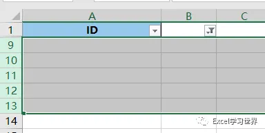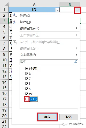 3. 点开 B 列的筛选菜单 –> 取消勾选“(空白)”–> 点击“确定”按钮