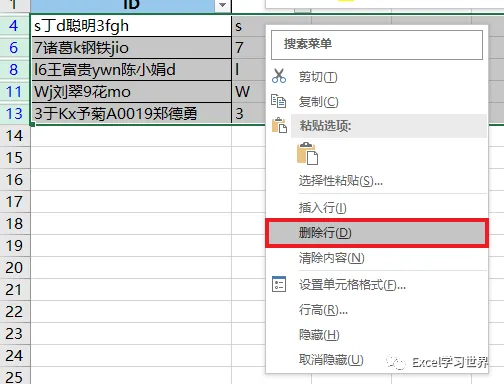 4. 选中所有筛选出来的行 –> 右键单击 –> 在弹出的菜单中选择“删除行”