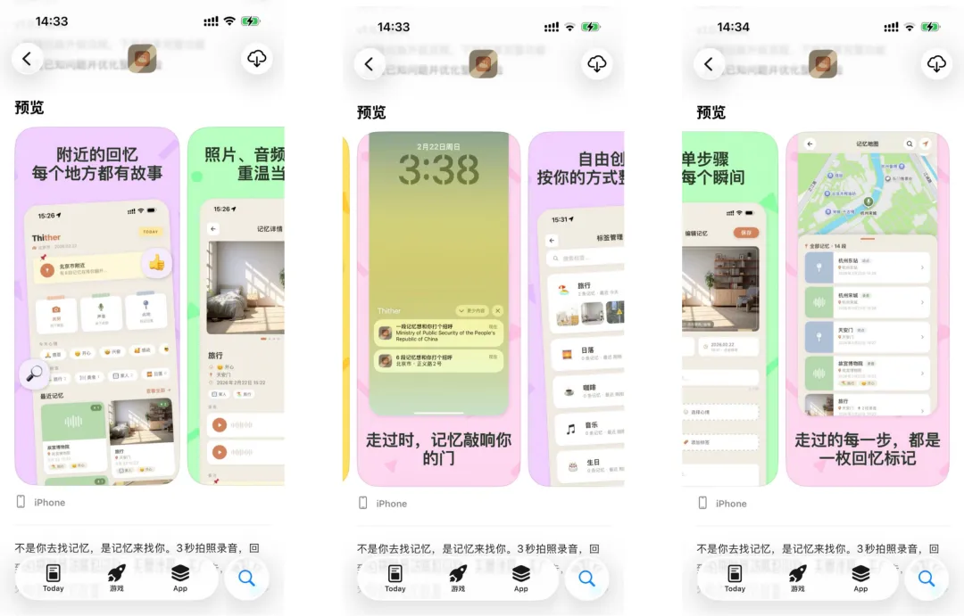 所以 Thither无需注册,无需登录。 数据本地存储,只有你能看到自己的记忆。「你的记忆,只属于你」,这不仅仅是一句口号,是产品底线。