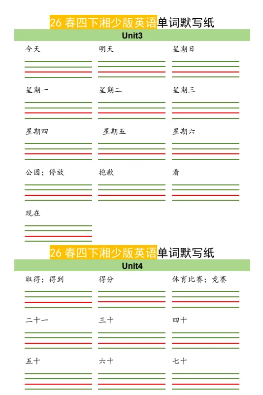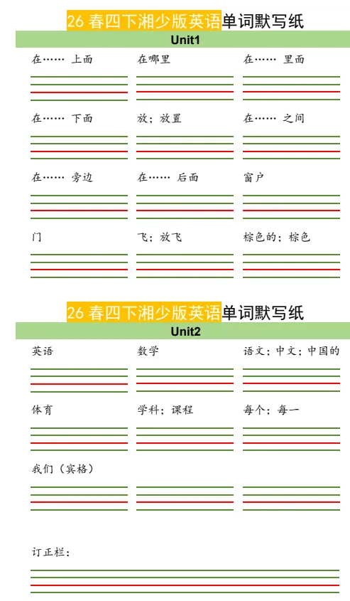 26春四下湘少版英语单词默写纸 电子版!可下载!