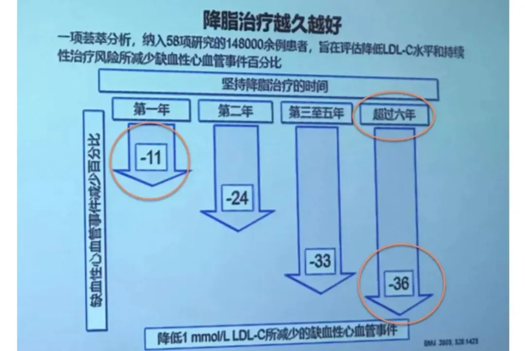 坚持服用降脂药物1年后,LDL-C每降低1mmol/L,发生缺血性心血管事件风险降低11%,2年后降低24%,超过6年降低36%。